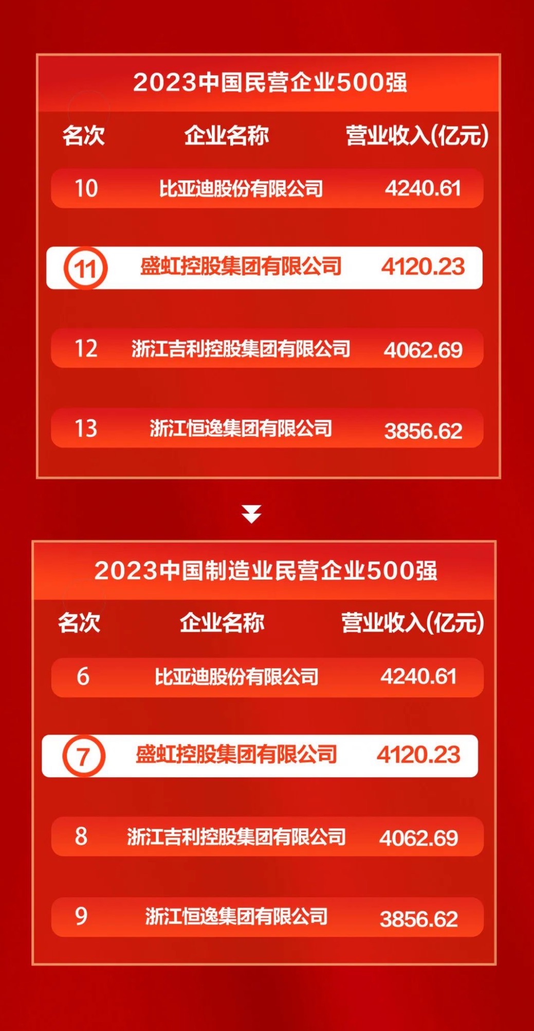 全国工商联9月12日发布“2023中国民营企业500强”榜单,SBOBET利记控股集团位列中国民营企业500强第11位,中国制造业民营企业500强第7位,以高质量发展的姿态稳居中国民营企业前列!