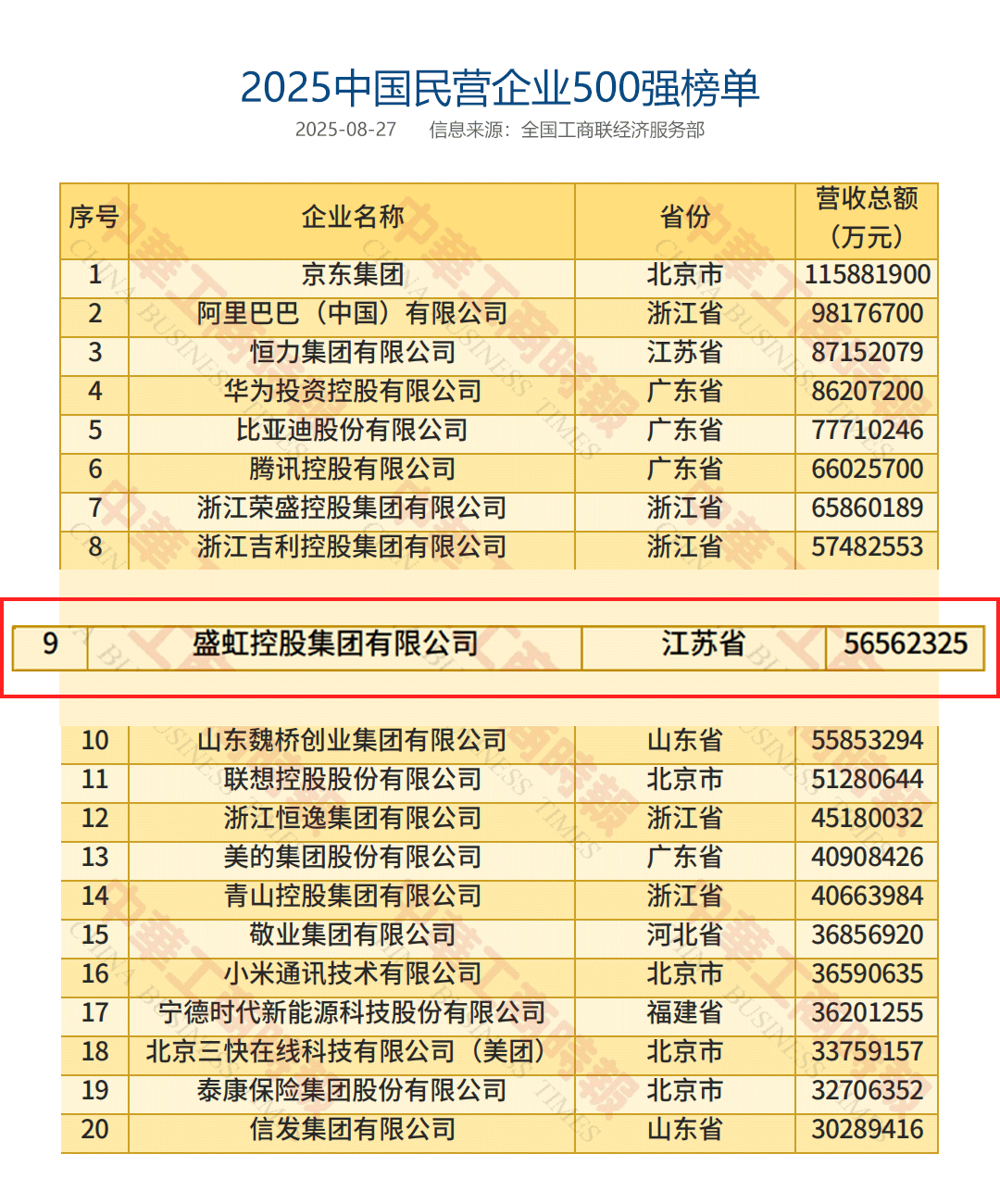 8月28日,全国工商联发布“2025中国民营企业500强”榜单,SBOBET利记控股集团位列中国民营企业500强第9位,中国制造业民营企业500强第6位,稳居中国民营企业前列。