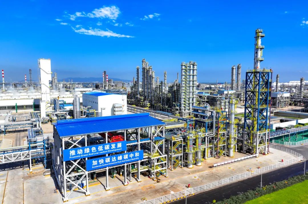 据介绍,石化生产过程中排放的二氧化碳被捕集后,与氢气发生化学反应形成甲醇,随后通过系统管廊进入下游装置,用于制造锂电池电解液溶剂、光伏膜材料等,形成了“二氧化碳捕集利用—绿色甲醇—新能源材料”的负碳产业链。